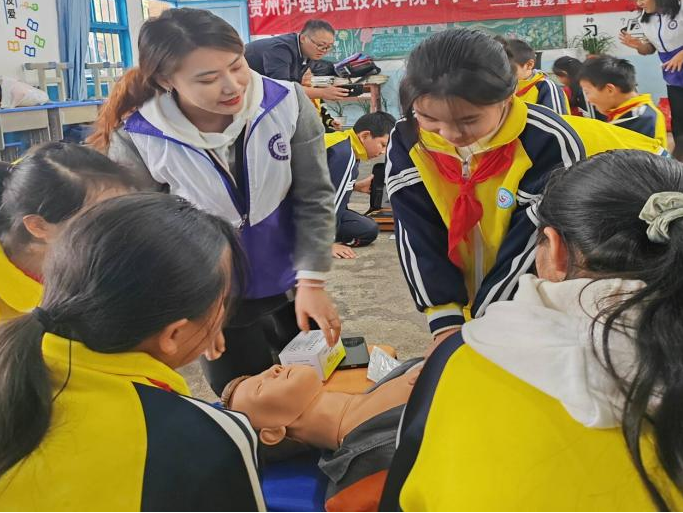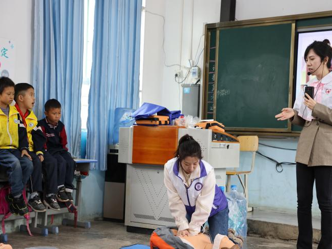 在龙场小学,为进一步加强乡村健康科普教育和健康促进工作,有效将急救知识、安全知识和健康知识推广覆盖到更多群体,营造“人人学急救,急救为人人”的良好社会氛围,助力乡村振兴,学院教师及学生代表走进教室。他们运用通俗易懂的语言,结合常见的案例,为龙场小学学生详细讲解了“海姆立克急救法”和“心肺复苏术”产生背景、使用场景、操作方法及注意事项等,并邀请小学生们进行现场模拟操作,手把手进行指导,激发了小学生们浓厚的学习兴趣。
