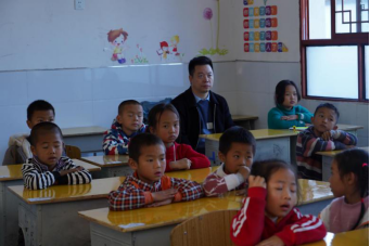 学生志愿者为孩子们检查视力