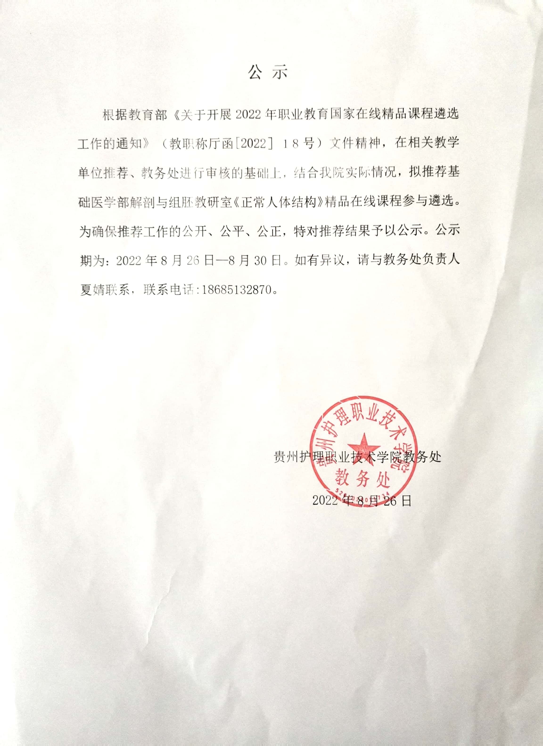 关于推荐我院参与国家级精品在线课程遴选的公示