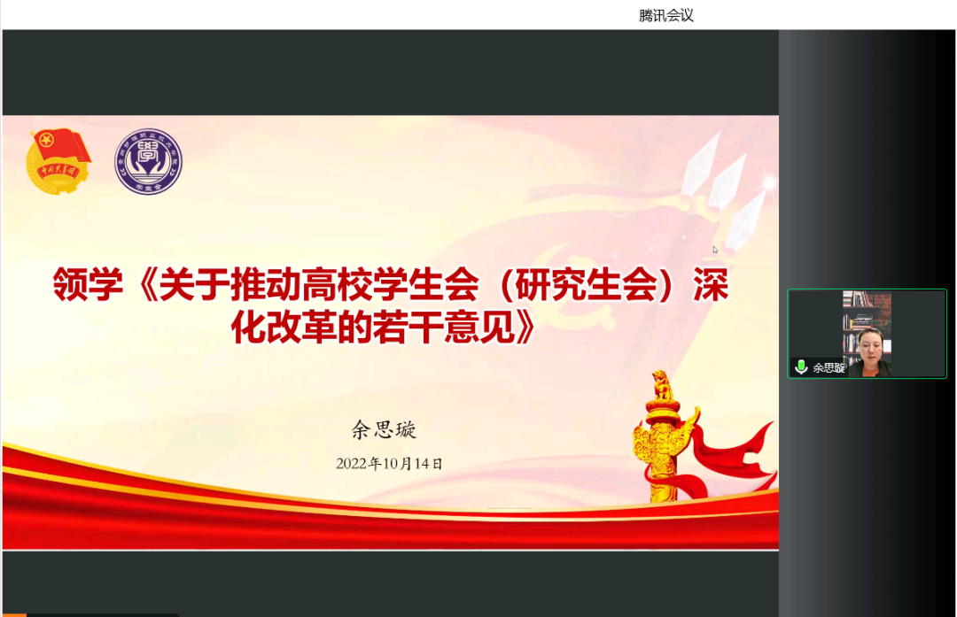 会议第一项:余思璇老师领学《关于推动高校学生会(研究生会)深化改革的若干意见》