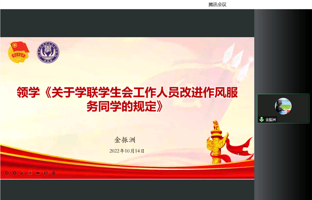 会议第二项:金振洲老师领学《关于学联学生会工作人员改进作风服务同学的规定》