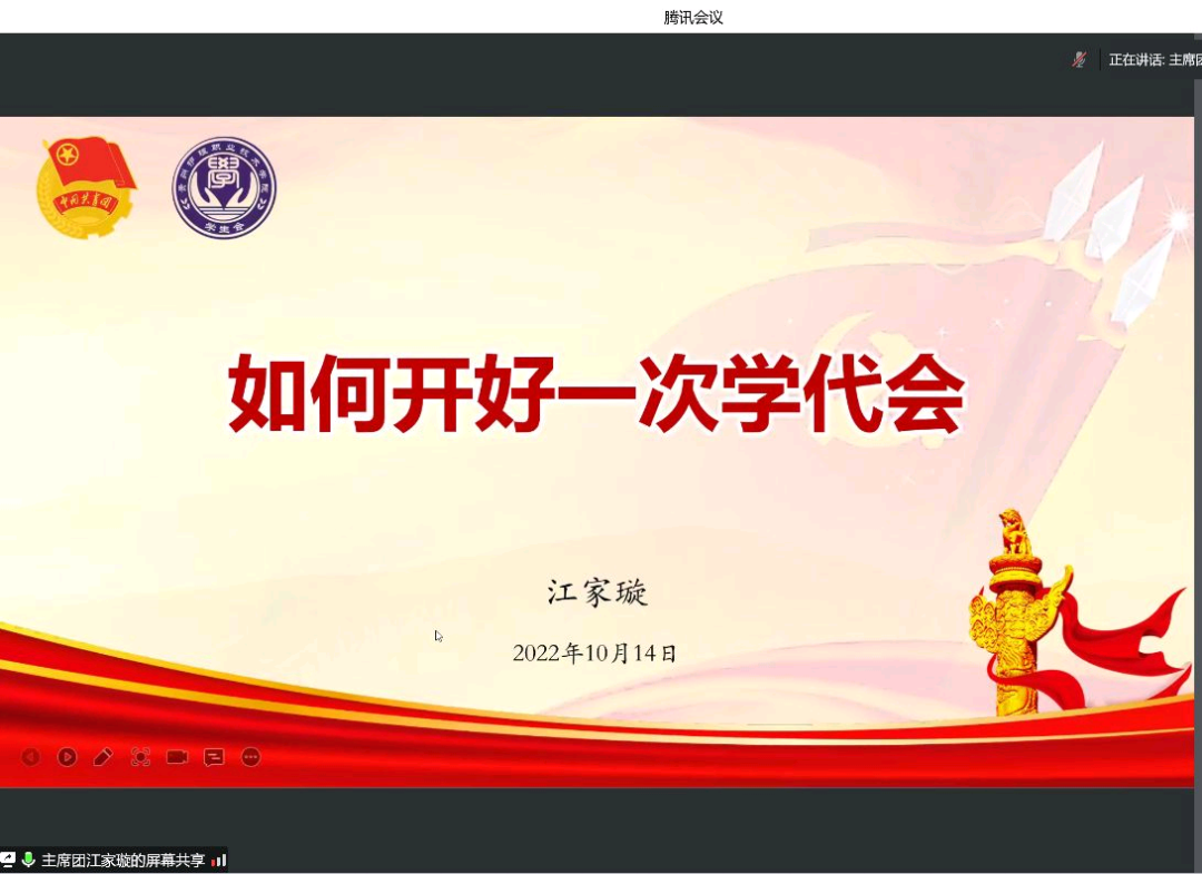 为深入学习贯彻习近平总书记关于青年工作的重要思想和关于教育的重要论述,落实习近平总书记在庆祝中国共产主义青年团成立100周年大会上的重要讲话精神,充分发挥共青团在高校学生思想政治工作中的主力军作用,持续深化学生会组织改革,加强学生会工作人员思想政治教育,进一步增强学生组织的引领力、组织力、服务力,支持和引导学生会更好的为同学们服务。我院于10月14日举行了2022年贵州护理职业技术学院学生会线上秋季培训会,本次会议由贵州护理职业技术学院学生会第三届主席团成员、执行主席江家璇主持,团委部分老师及学生会全体工作人员参会。