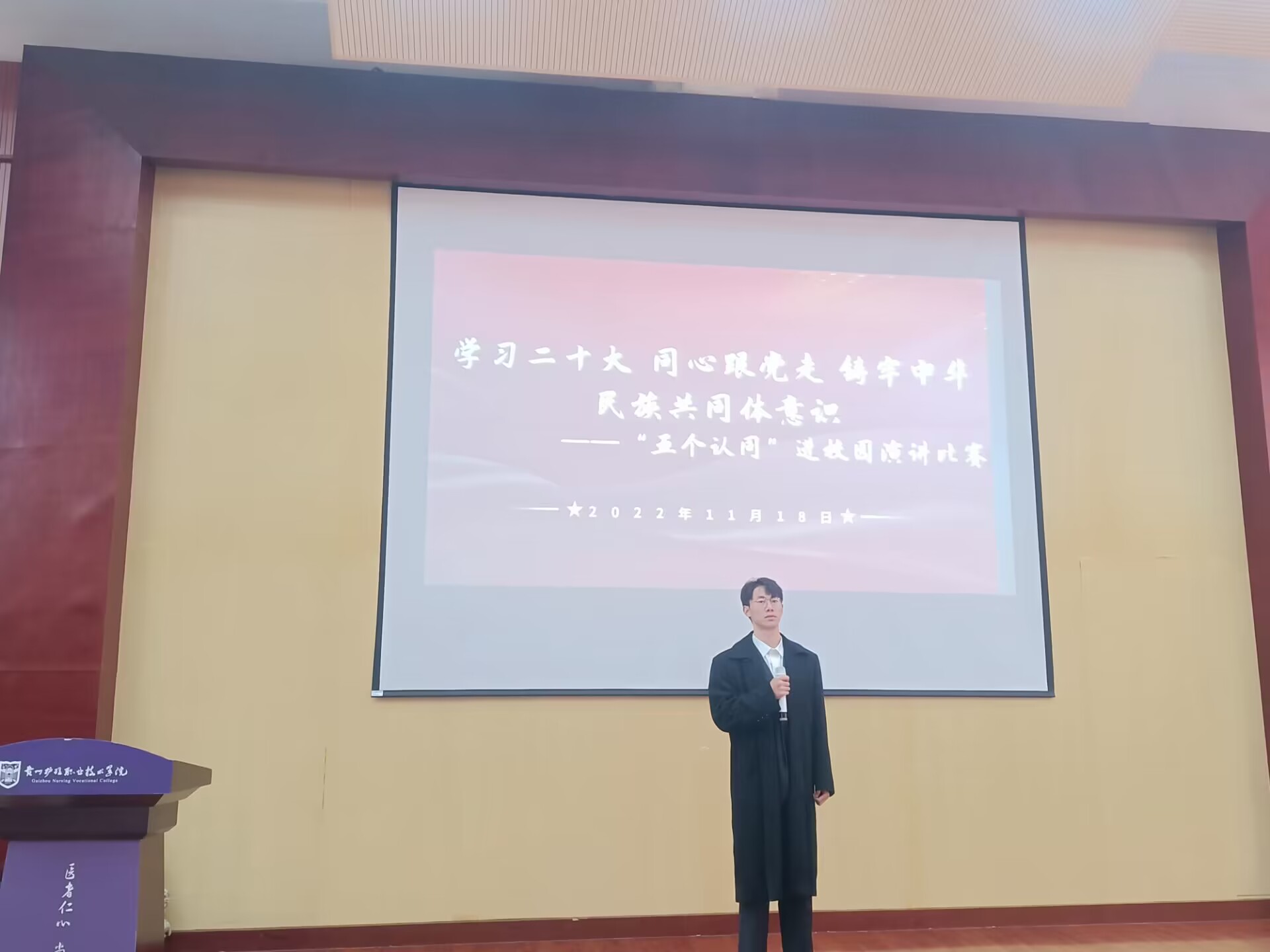 为深入学习党的二十大精神,进一步贯彻落实中央、省委、州委民族工作会议精神,扎实推进我州创建铸牢中华民族共同体意识模范州工作,引导我院学子铸牢中华民族共同体意识和增强对伟大祖国、中华民族、中华文化、中国共产党、中国特色社会主义的认同,牢固树立正确的祖国观、历史观、民族观,为学习贯彻党的二十大精神营造良好社会氛围,根据黔南统通【2022】33号文件,我院于11月18日下午在我院知行楼音乐厅开展了学习党的二十大 同心跟党走 铸牢中华民族共同体意识——“五个认同”进校园演讲比赛。