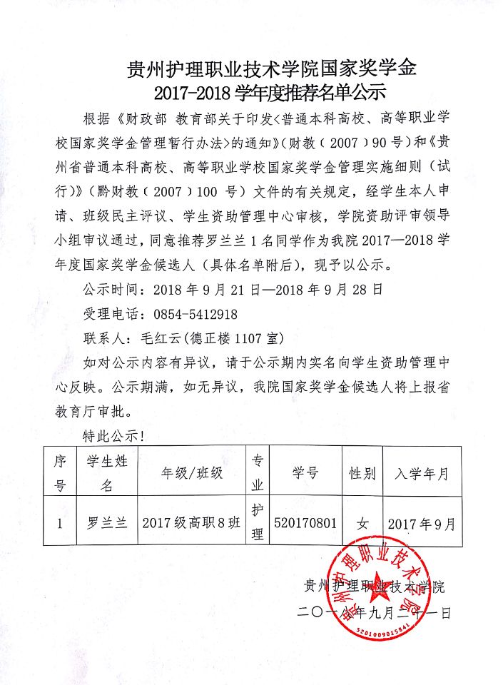 贵州护理职业技术学院国家奖学金2017-2018年度推荐名单公示