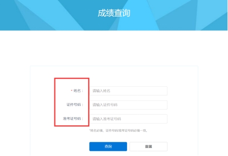 第二步:输入“姓名、证件号码”或者“姓名、准考证号码”,点击“查询”即可显示成绩查询结果。